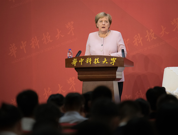German Chancellor Angela Merkel delivers a speech at Huazhong University of Science and Technology in Wuhan, capital city of central China's Hubei Province, Sept. 7, 2019. (Xinhua/Xiao Yijiu)