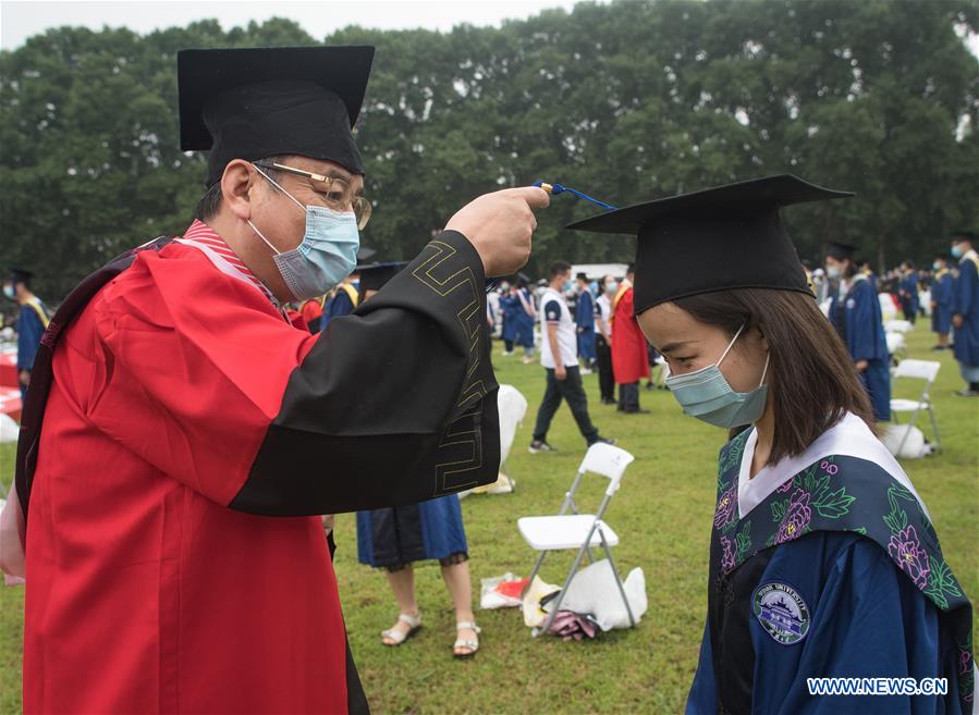 A supervisor turns the tassel for a student at the commencement ceremony of Wuhan University in Wuhan, central China's Hubei Province, June 20, 2020.