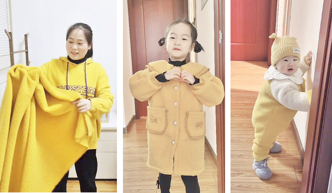 Last December, Liu made the four New Year outfits for her daughter. Her vlogs enjoyed great popularity on the internet because of her exquisite craftsmanship. One of her videos hit more than 12 million views. After the Little New Year's Day (a preliminary day that falls one week before the real Chinese New Year's Day), Liu found a 1.5-meter piece of dark yellow polar fleece and a piece of artificial leather in similar color at home. With these materials, she made another three pieces of clothing for her daughter and a pair of overalls for her son.