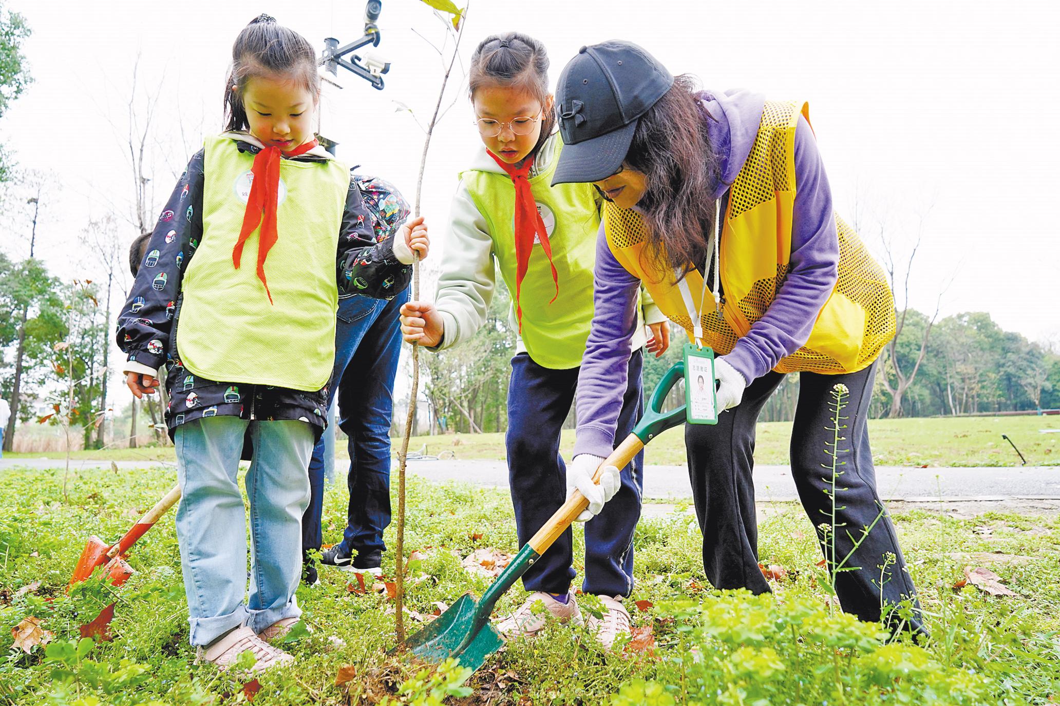 Photo taken on March 11, 2023 shows children planting trees in Wuhan Botanical Garden. China marked the country's 45th National Tree Planting Day on Sunday.