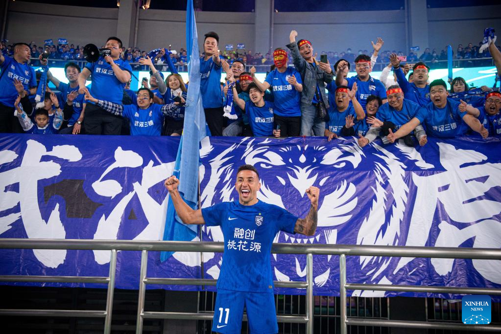 Davidson da Luz Pereira (below) of Wuhan Three Towns celebrates with the supporters after winning the Chinese Football Association (CFA) Super Cup match between Wuhan Three Towns and Shandong Taishan in Hangzhou, east China's Zhejiang Province, April 8, 2023.