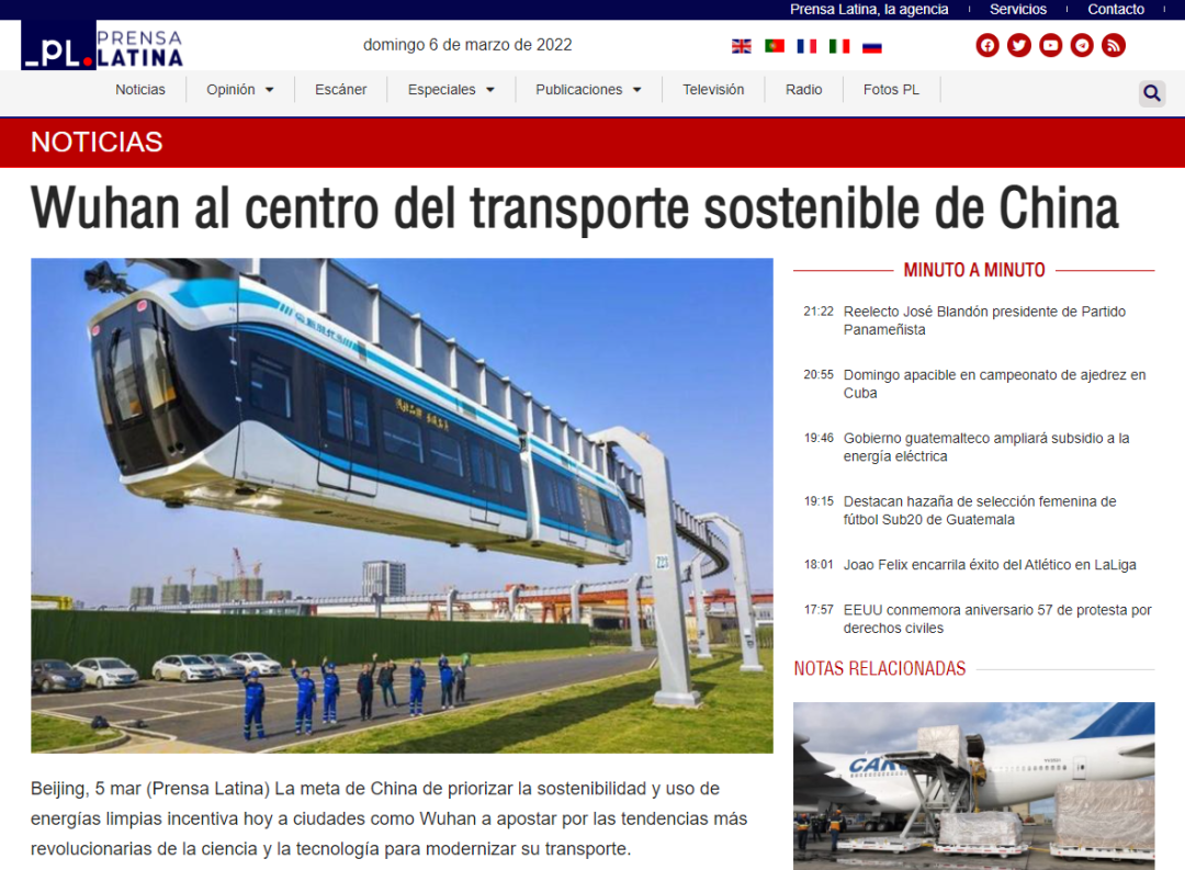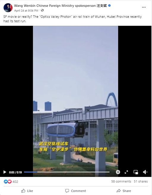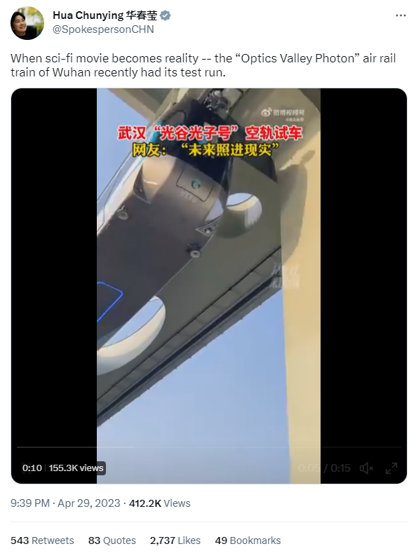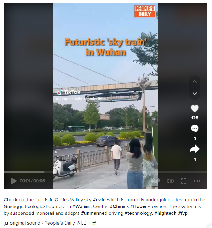 Recently, Assistant Foreign Minister Hua Chunying shared a video of the Optics Valley suspended monorail (also known as "sky train") in Wuhan on her Twitter account, accompanied by "When sci-fi movie becomes reality — the 'Optics Valley Photon' air rail train of Wuhan recently had its test run."