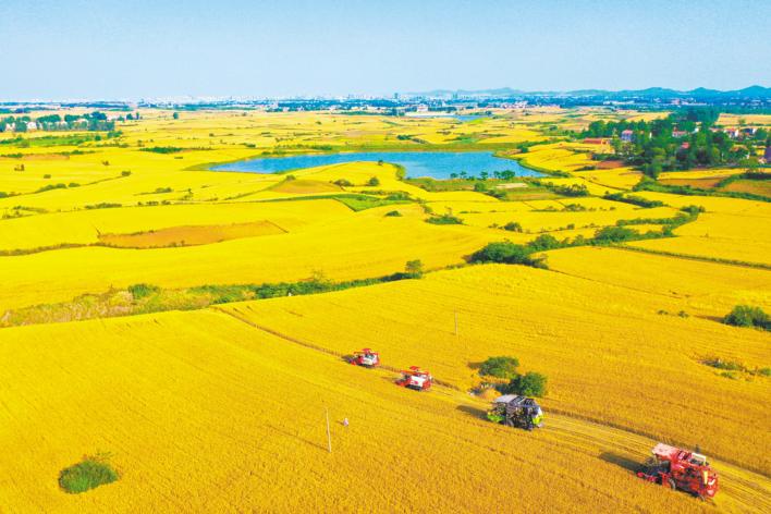 Photo taken on May 17 shows harvesters reap wheat in Shangyan Village of Niushou Township in Xiangyang City, Hubei Province. As one of the country's ten major summer grain producing areas, Xiangyang has a perennial wheat planting area of 5.4 million mu (mu: a Chinese unit equivalent to 667 square meters), contributing to about 50 percent the province's wheat production. (Photo: Hubei Daily)