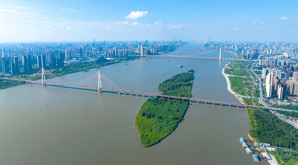 Aerial photo taken on July 10 shows the picturesque scenery of the Yangtze River in Wuhan, capital city of Hubei Province.