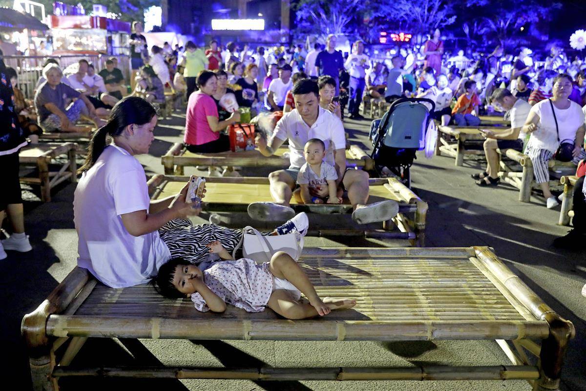 Photo taken on July 14 shows people in Wuhan enjoying performances and coolness brought by bamboo beds in Hankouli of Wuhan Garden Expo Park. The 5th Hankouli bamboo bed cultural festival opened on the day. More than 200 bamboo beds was put in place at the festival to enable visitors to re-experience the traditional Wuhan way of cooling off on hot summer nights. The festival will run until August 22. (Photo: Hubei Daily/Ni Na, Xu Zhigang and Yanjun)
