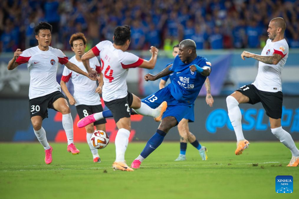 Markao (2nd R) of Wuhan Three Towns shoots during a 2023 season Chinese Football Association Super League (CSL) 19th round match between Wuhan Three Towns and Qingdao Hainiu in Wuhan, central China's Hubei Province, July 30, 2023.