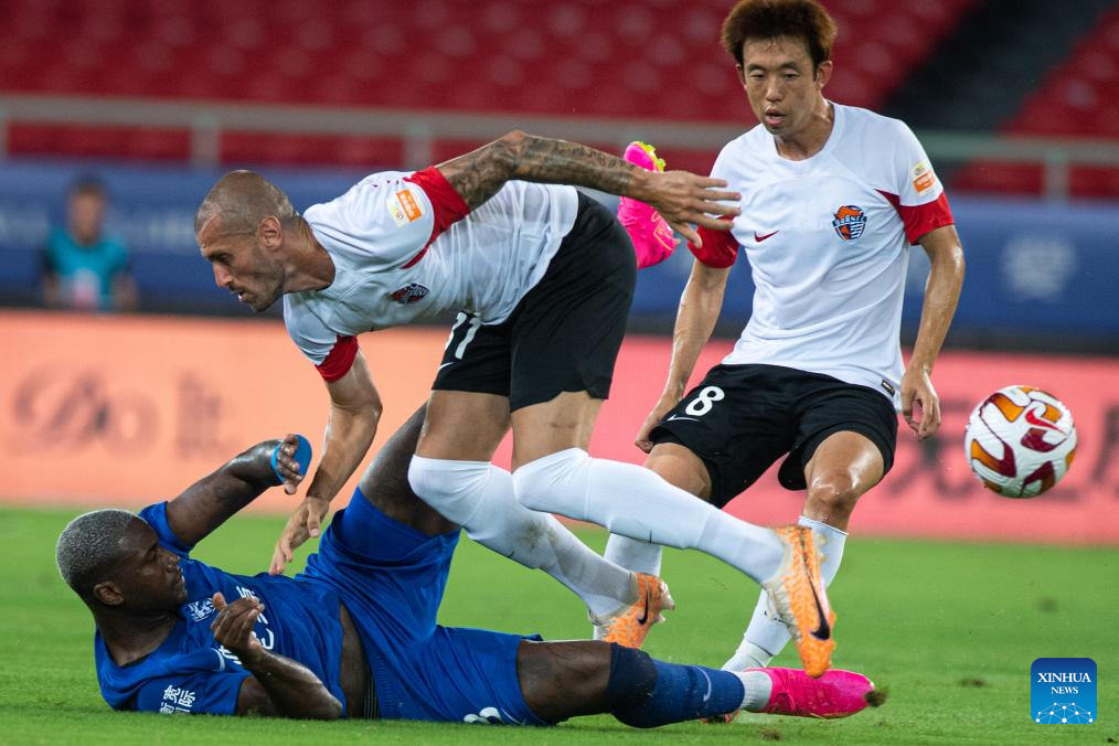 Markao (L) of Wuhan Three Towns vies against Aleksandar Andrejevic (C) of Qingdao Hainiu during a 2023 season Chinese Football Association Super League (CSL) 19th round match between Wuhan Three Towns and Qingdao Hainiu in Wuhan, central China's Hubei Province, July 30, 2023.