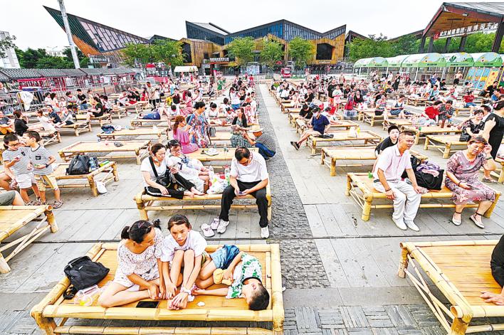 People enjoy coolness brought by bamboo beds in Hankouli of Wuhan Garden Expo Park on August 12, in Wuhan, Hubei's capital city.