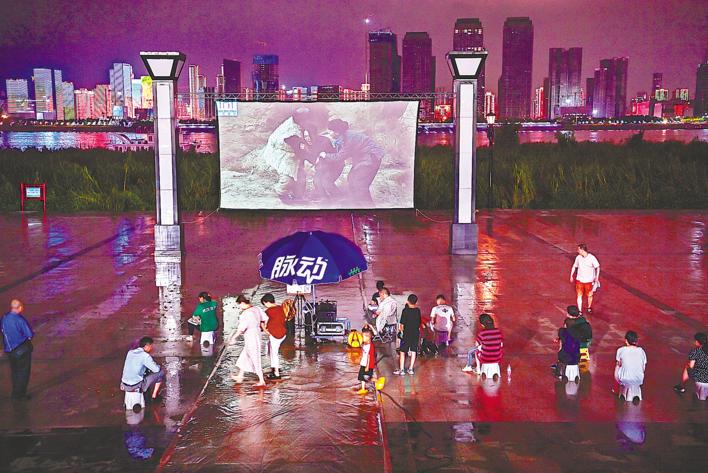 People watch free outdoor movies by the Yangtze River on August 1 in Wuhan, Hubei's capital city.