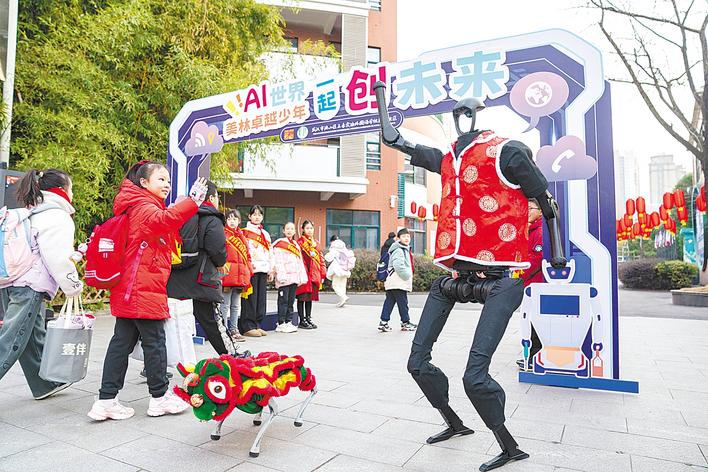 Photo taken on Feb. 13, 2025 shows students greeting an intelligent robot dog and a humanoid robot at a primary school in Wuhan, central China's Hubei Province. Middle schools, primary schools and kindergartens in Wuhan welcomed the first day of the new semester on Thursday. Students began the term with diverse "first lesson" activities, marking the start of a fresh academic journey.
