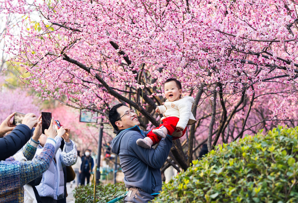 People enjoy plum blossoms at Shahu Park in Wuhan, capital city of Hubei Province, on Feb.16, 2025. There are more than 100 urban parks and scenic spots with plum blossoms in Wuhan.