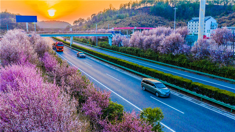Photo taken on March 19, 2025 shows the purple-leaf plum trees in full bloom along a section of Shanghai–Wuhan Expressway in Hubei Province.