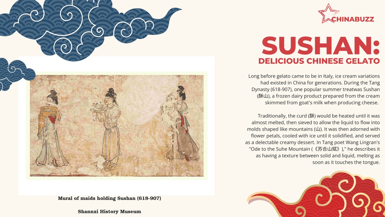 Long before gelato came to be in Italy, ice cream variations had existed in China for generations. During the Tang Dynasty (618-907), one popular summer treat was Sushan (酥山), a frozen dairy product prepared from the cream skimmed from goat's milk when producing cheese.