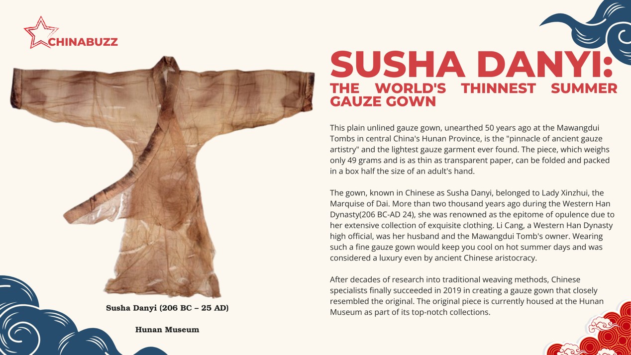 The gown, known in Chinese as Susha Danyi, belonged to Lady Xinzhui, the Marquise of Dai. More than two thousand years ago during the Western Han Dynasty (206 BC-AD 24), she was renowned as the epitome of opulence due to her extensive collection of exquisite clothing. Li Cang, a Western Han Dynasty high official, was her husband and the Mawangdui Tomb's owner. Wearing such a fine gauze gown would keep you cool on hot summer days and was considered a luxury even by ancient Chinese aristocracy.