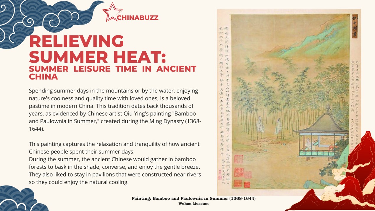 Spending summer days in the mountains or by the water, enjoying nature's coolness and quality time with loved ones, is a beloved pastime in modern China. This tradition dates back thousands of years, as evidenced by Chinese artist Qiu Ying's painting "Bamboo and Paulownia in Summer," created during the Ming Dynasty (1368-1644).