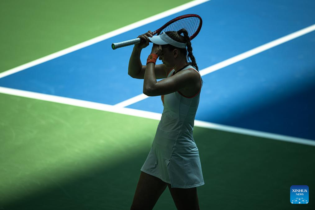Elena Rybakina reacts during the women's singles quarterfinal match between Elena Rybakina of Kazakhstan and Aryna Sabalenka of Belarus at the 2025 Wuhan Open tennis tournament in Wuhan, central China's Hubei Province, Oct. 10, 2025.