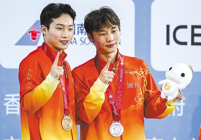 Gold medalist Wang Zongyuan (L), silver medalist Zheng Jiuyuan pose during the awarding ceremony for the men's 3m springboard final of diving at the China's 15th National Games in Guangzhou, south China's Guangdong Province, on Nov. 10, 2025. It was the first gold medal won by the Hubei delegation at the 15th National Games.