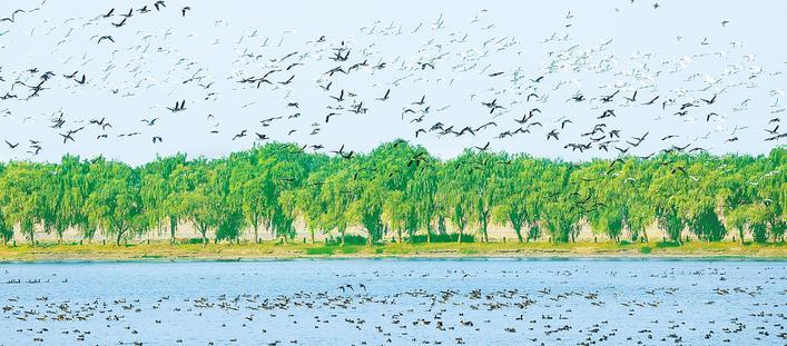 Photo taken on Dec. 1, 2025 shows a flock of migratory birds swarming over the Tian’e Lake at the Fuhe Wetland in Wuhan City, Hubei Province, creating a landscape depicting the harmonious coexistence of humans and nature. In recent years, the environmental protection of the wetland has been enhanced. The number of wintering birds visiting the wetland has doubled to over 20,000 so far this year from about 10,000 at the same time last year, and is expected to reach more than 30,000 by the end of this month.