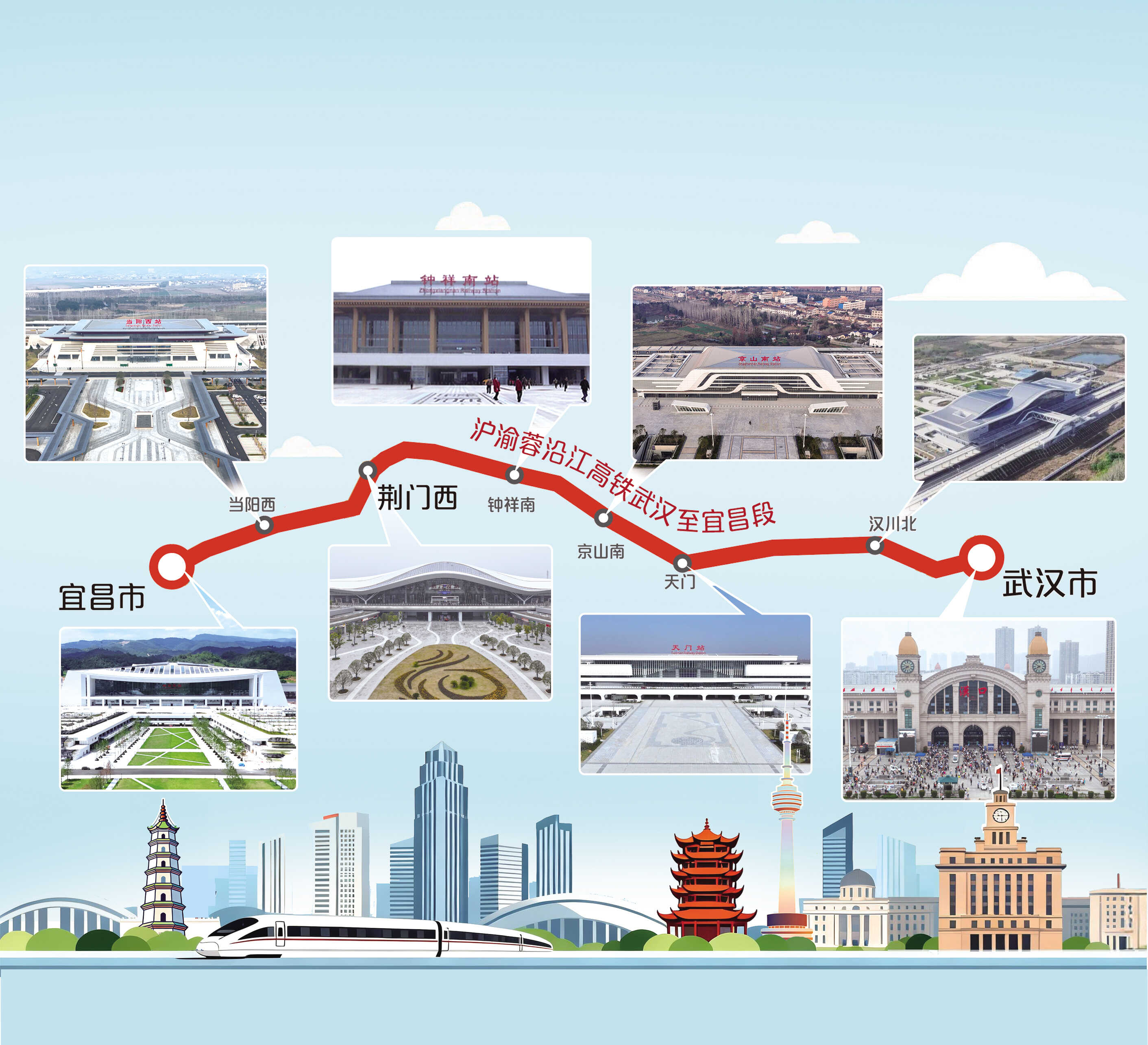 The railway line starts from Hankou Railway Station and ends at Yichang North Railway Station, stretching 314 kilometers with a design speed of 350 kilometers per hour. It commenced construction in September 2021 and features a total of eight stations.