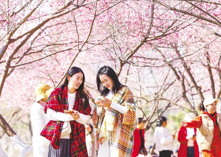 Photo taken on Jan. 8, 2026 shows tourists enjoying plum blossoms at the "Plum Blossom Slope" in Zhuyehai Park, Wuhan City, where early plum blossoms have bloomed a month earlier than usual.