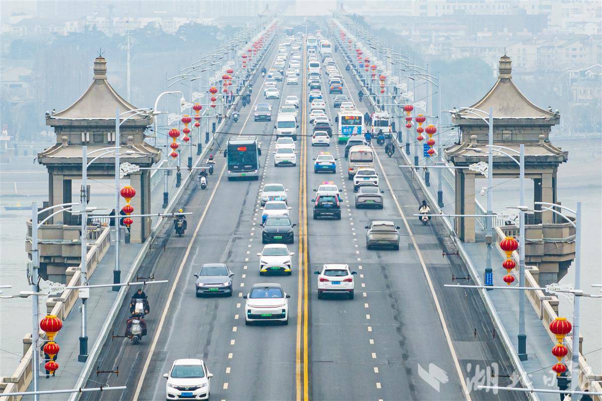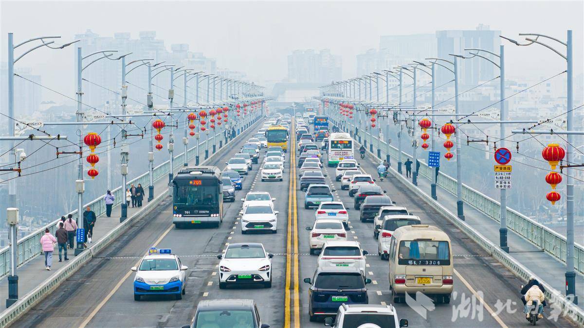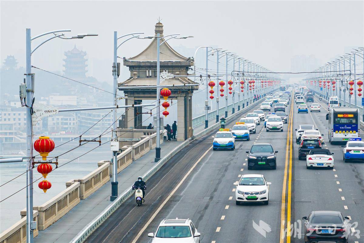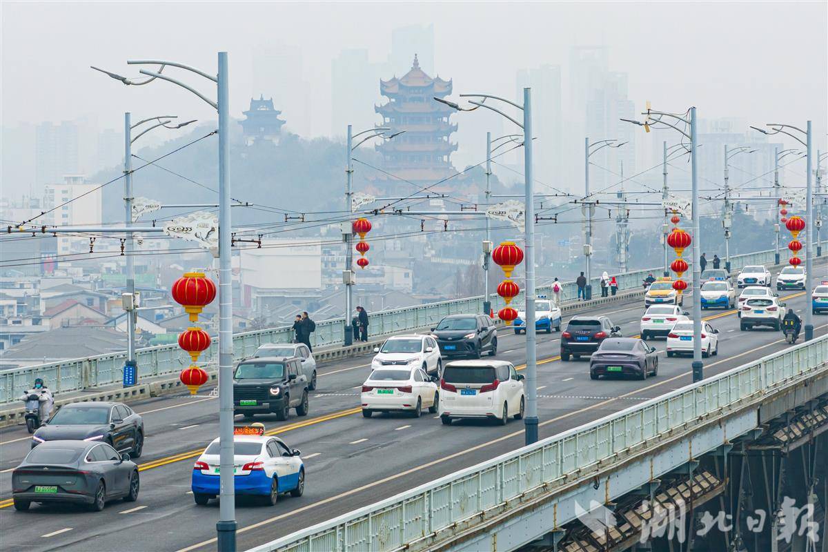 Photos taken on Feb. 5, 2026, show red lanterns hanging on the Wuhan Yangtze River Bridge in Wuhan, in celebration of the upcoming Chinese New Year.