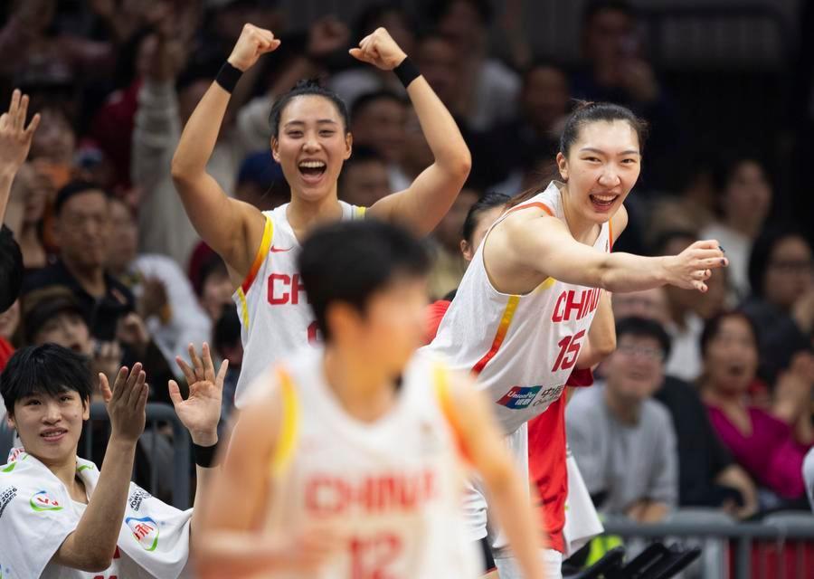 Han Xu (R) and Tang Ziting of China celebrate a score by teammate Chen Yujie during the group A match between China and South Sudan at FIBA Women's World Cup Qualifying Tournaments in Wuhan, central China's Hubei Province, March 14, 2026.